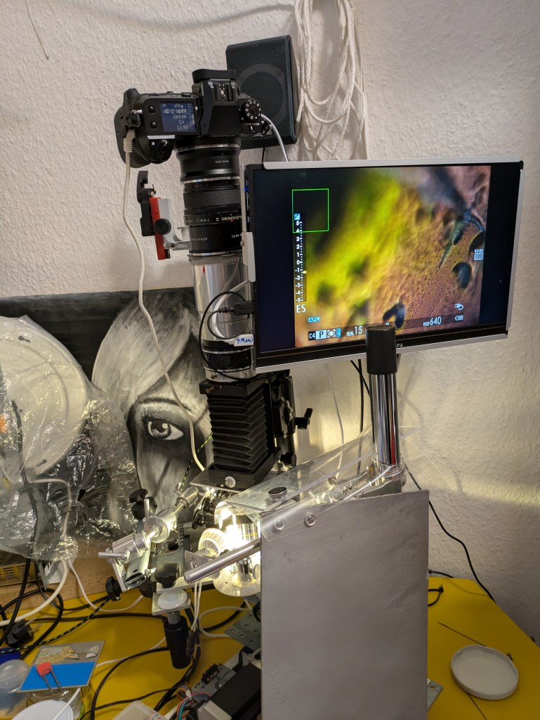 An meiner Makrostacking-Apparatur (Focus Stacking) mit dem alten Krokus 6×6 Vergrößerer habe ich die Ausleuchtung überarbeitet und die Steuerung für die Fuji GFX 50 S II mit LAOWA Objektiven 100mm/ 2,8 und 25mm/2,8 mit einem Arduino an einem Servomotor neu kalibriert und mit zwei Auflaufbremsen gesichert. Die Vergrößerer-Apparatur ist jedoch ohne Wandmontage sehr schwingungs-empfindlich.