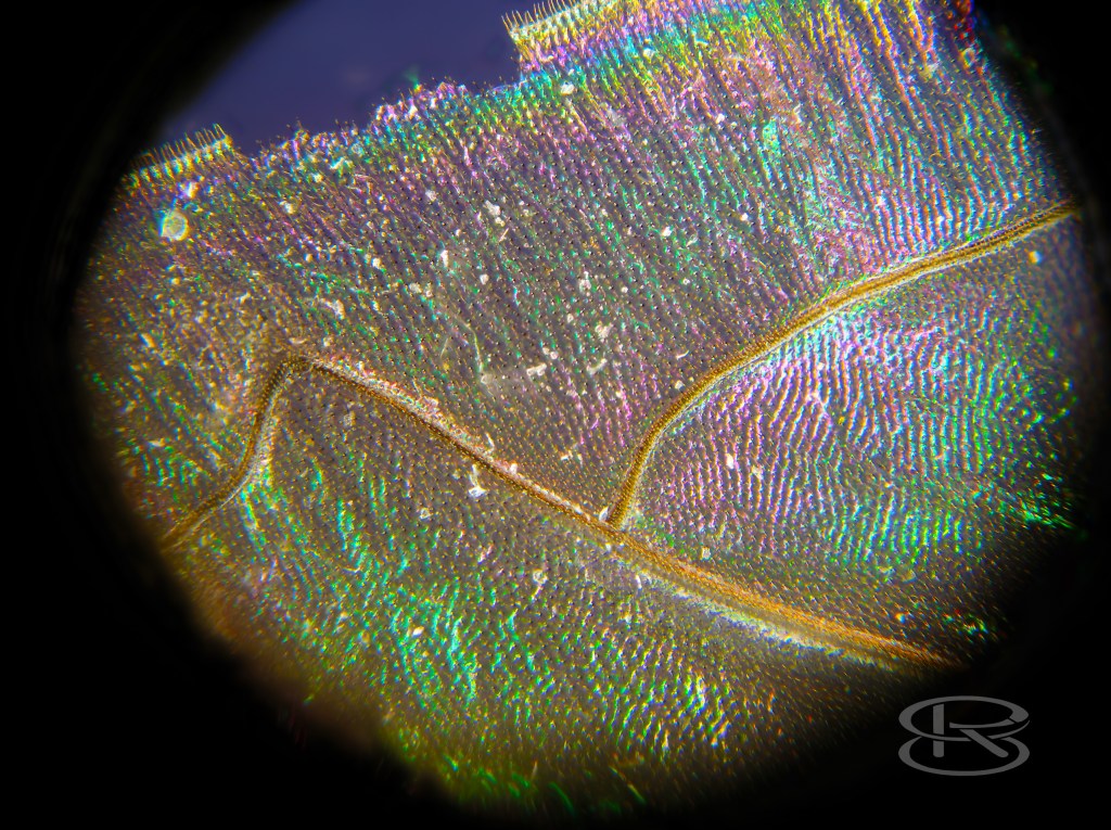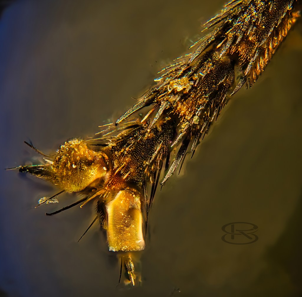 Flügeldetail 20x Leitz, Goldfliege Flügelgelenk 40x. Bei dem Flügelgelenk ist die „Dreigangschaltung“ zum Einrasten zu erkennen. Schmeißfliege Fuß 20x Leitz mit Pradovit 200mm als Tubuslinse.