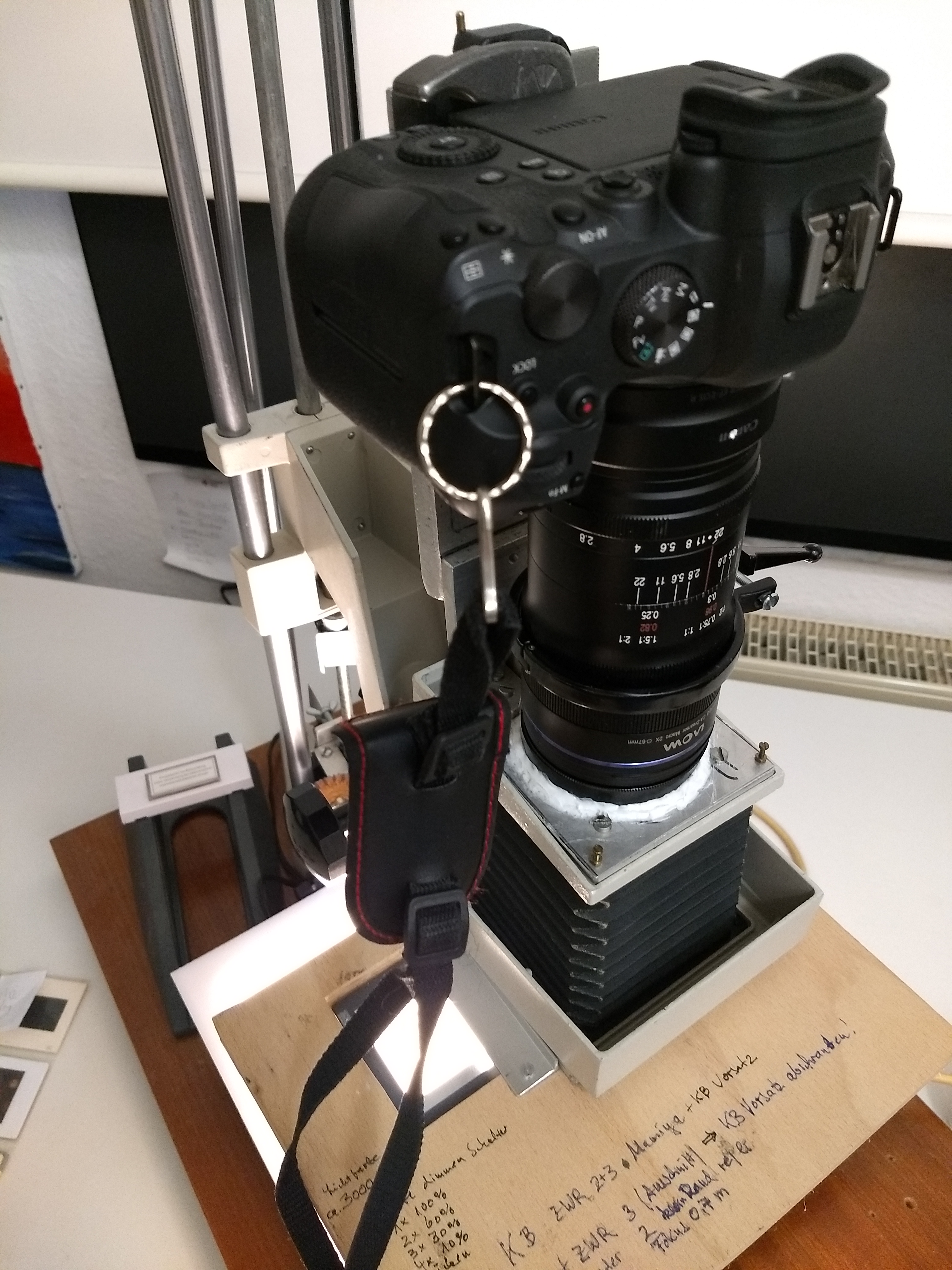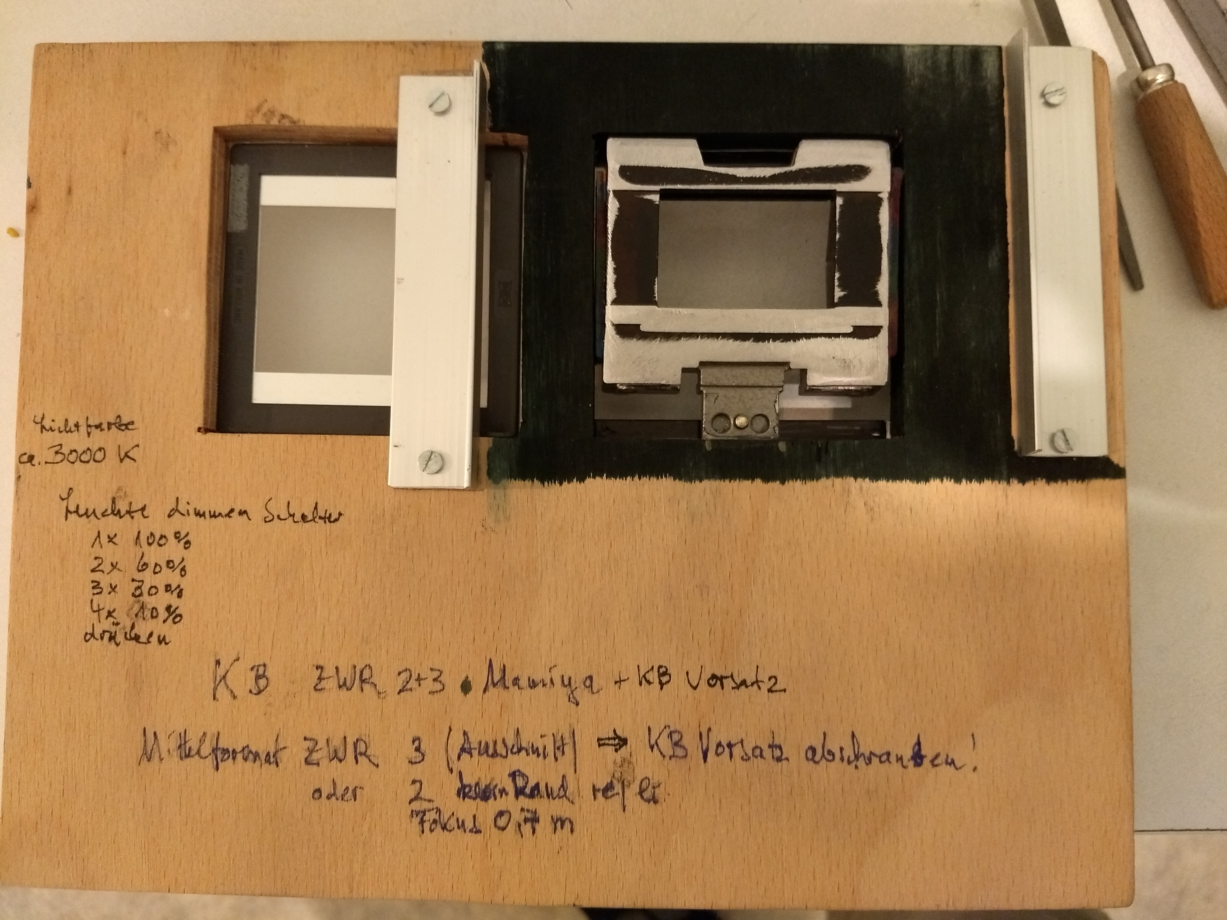 Repro-Apparatur für KB- und Mittelformat-Filme Ein alter Krokus-Vergrößerer (6×6) wurde dafür umgebaut Zurück zum Start-Menü