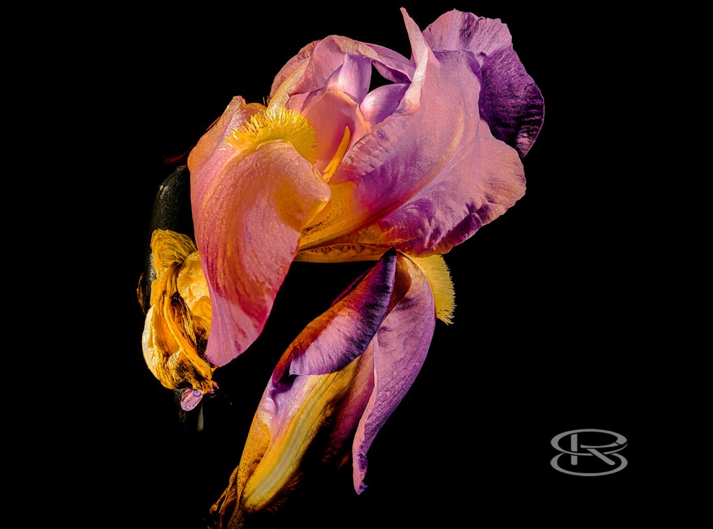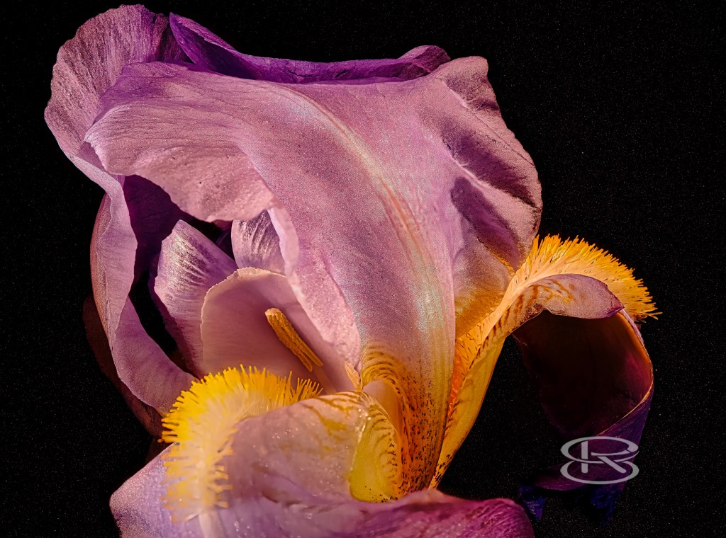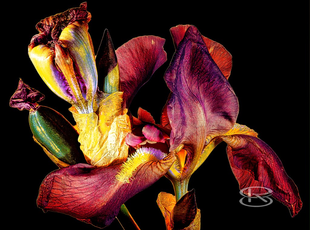 Deutsche Schwertlilie, Iris germanica, 3 Fotos,Blüten teilweise geöffnet mit Narben und Staubblättern, Fuji GFX 50S II Stack 80 bis 200 Einzel-Aufnahmen, Fujinon 35-70 mm, Alu-Dibond, 100×75 cm