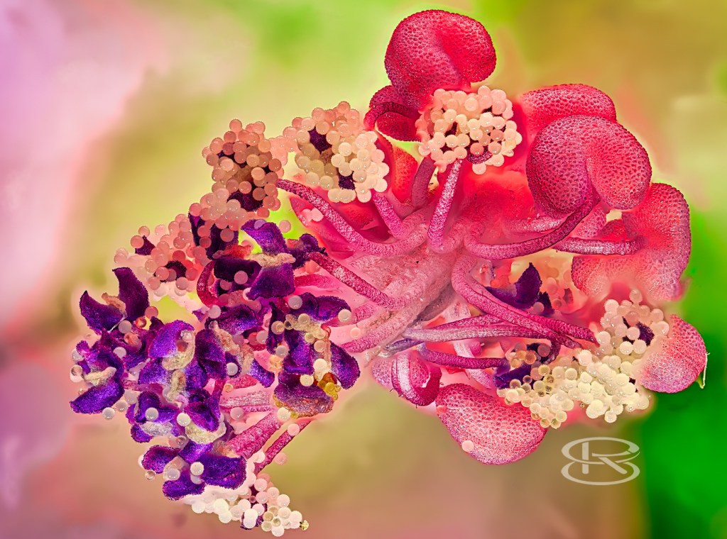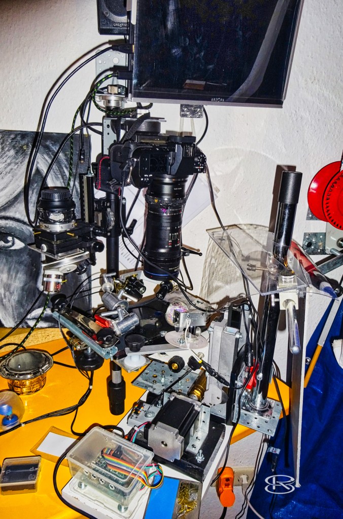 Die Blütendetails wurden mit einer Mikro-Photostacking-Apparatur angefertigt: Für die hier gezeigten Blütendetails habe ich viele Jahre an einer Apparatur gebaut. Die ersten Versuche begannen im Jahr 2011 mit einem umgebauten Studien-Mikroskop. Die vielen Entwicklungsschritte der Apparatur führten zu der heute benutzten über Computer gesteuerten Mikrostacking-Apparatur. Hierbei entstehen schichtweise viele (teilweise bis über tausend) Aufnahmen, die dann mit dem Computer zu einem Foto zusammengerechnet werden.