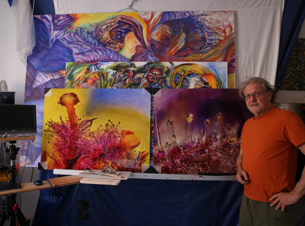 Ich zeige im ArtShop u.a. die in den letzten Monaten entstandenen großformatigen farbenfrohen Fotostudien und Acrylbilder von Blütendetails. Zwei meiner metergroßen provokanten „Warchild“ Acrylbilder sowie meine Fotomontage „Die Horde“ entstanden in Auseinandersetzung mit dem menschlichen Dilemma tausendfachen Leids in der Ukraine, in Israel und in Gaza.