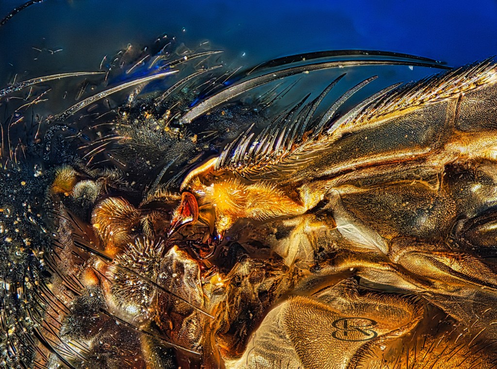 Blaue Schmeißfliege, Calliphora vicina, Bereich des Flügelgelenks, Stack 277 Einzel-Aufnahmen, 10x Mikroobjektiv, Alu-Dibond, 100×75 cm