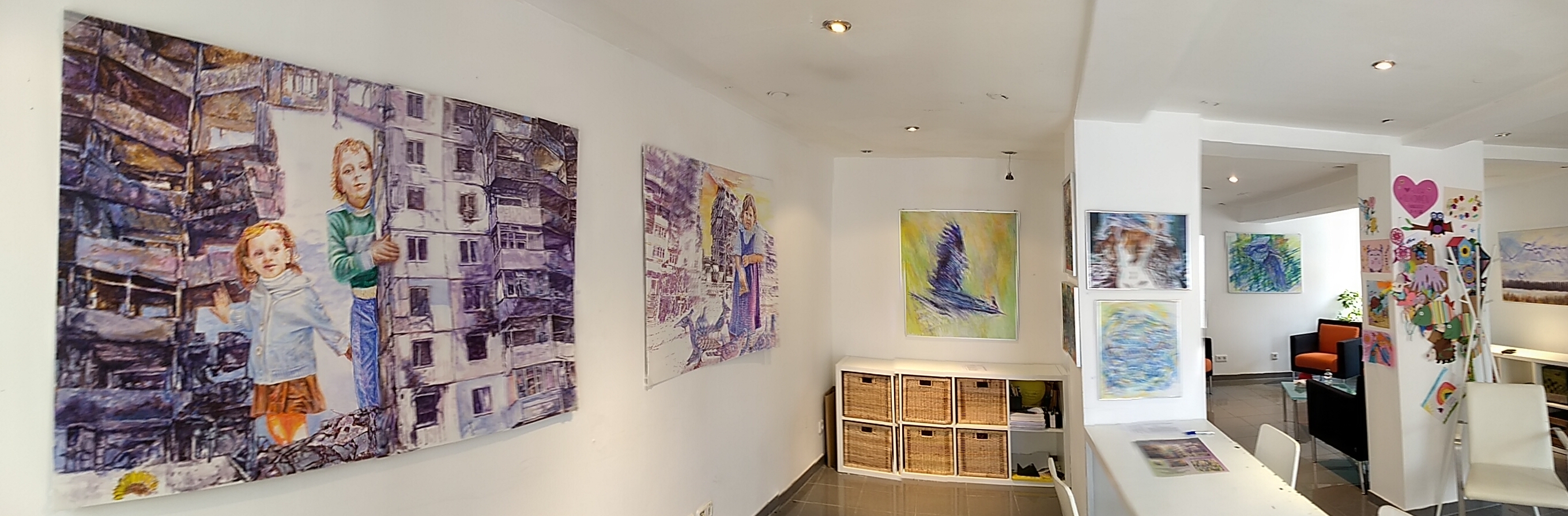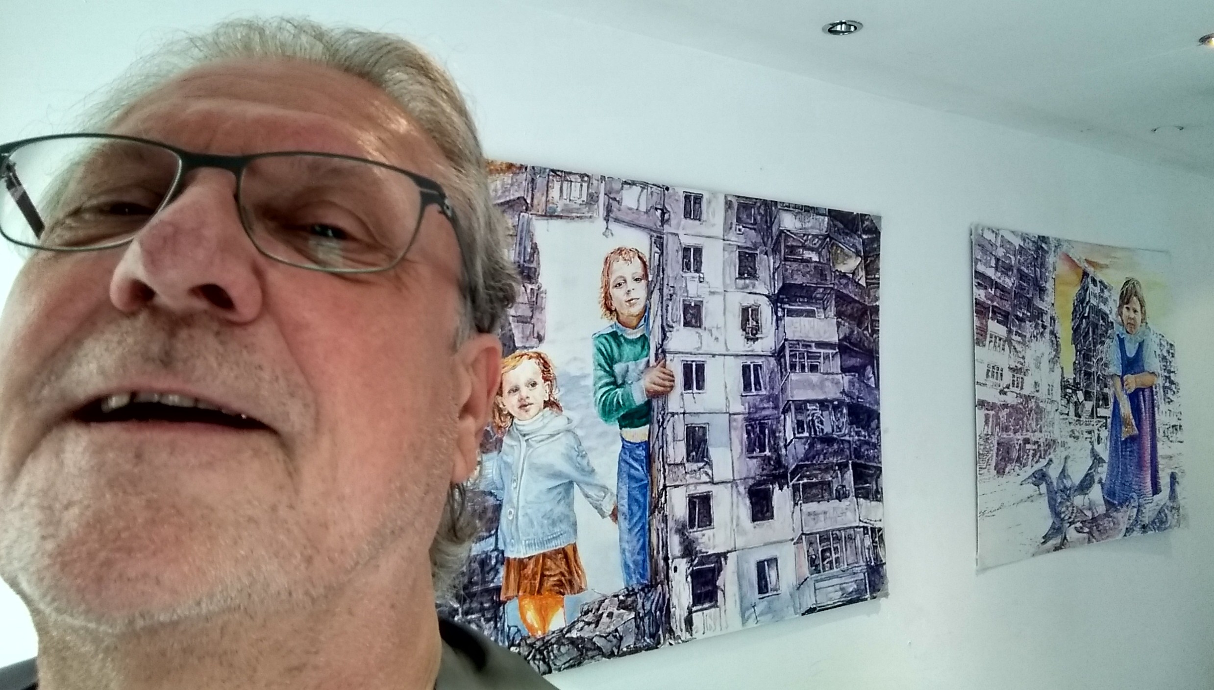 Zu sehen in meiner „Visionen“ genannten Ausstellung ist u.a. meine aktuelle „Warchild“-Werkserie in metergroßen Formaten zum russischen Angriffskrieg auf die Ukraine. Die Acrylfarben, mit Pinsel auf Hartfaser aufgetragen, wirken auf den ersten Blick wie fototechnische Abzüge oder Drucke – aber es handelt sich hier um reine Malerei! Als Vorlage dienten allerdings grobe Foto-Kollagen aus „Idylle-Kinder-Bildern“, die ich vor über 30 Jahren im Rothaargebirge, auf Korsika und in Venedig, also in einer „anderen Welt und Zeit“ analog fotografiert habe. Diese „heile“ Kinderwelt „konfrontiere“ ich in dieser Bild-Serie „WARCHILD 1 bis 4“ mit entsprechend angepassten und veränderten Aufnahmen aktueller Internet-Publikationen der TAZ, des n-tv und anderen Fotoquellen von zerstörten Wohnvierteln in der Ukraine aus dem Jahr 2022.